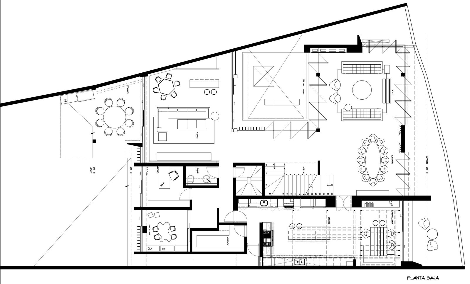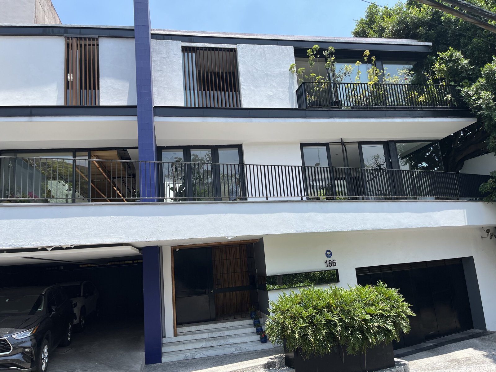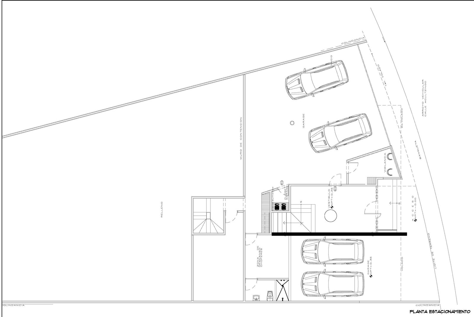 Nivel de calle: Recibidor, 6 lugares de estacionamiento, bodega, cuarto de choferes con baño, caseta de seguridad.