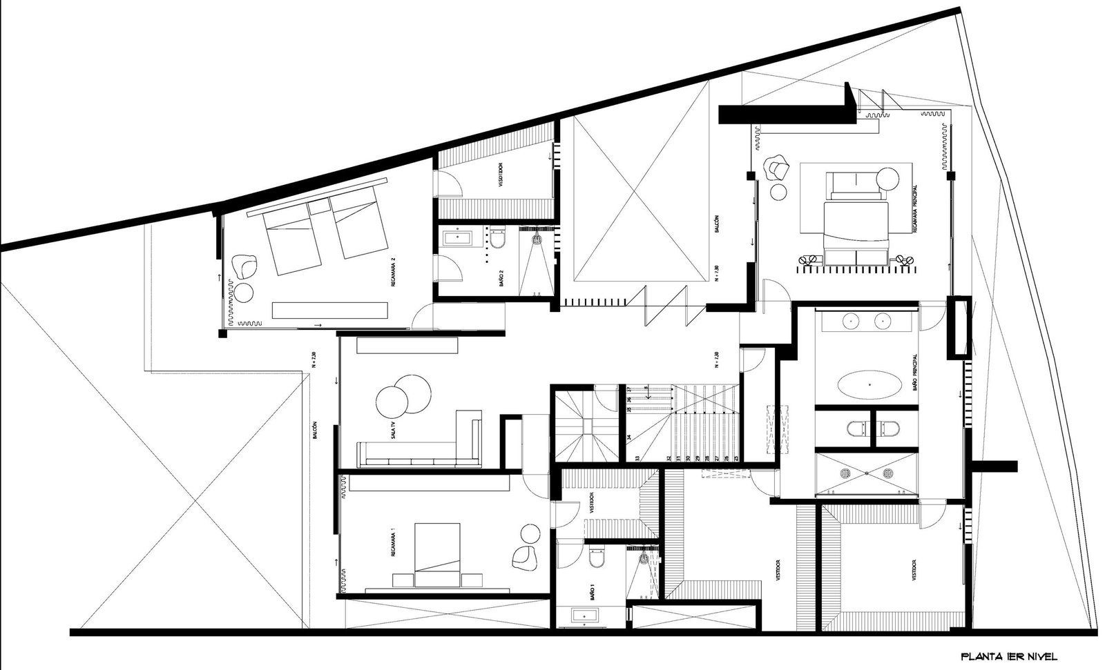 1er nivel: Amplio patio interno, sala, comedor, cocina con espacioso antecomedor, oficina, gimnasio, baño de visitas, cuarto de tv con bar, terraza, jardín.